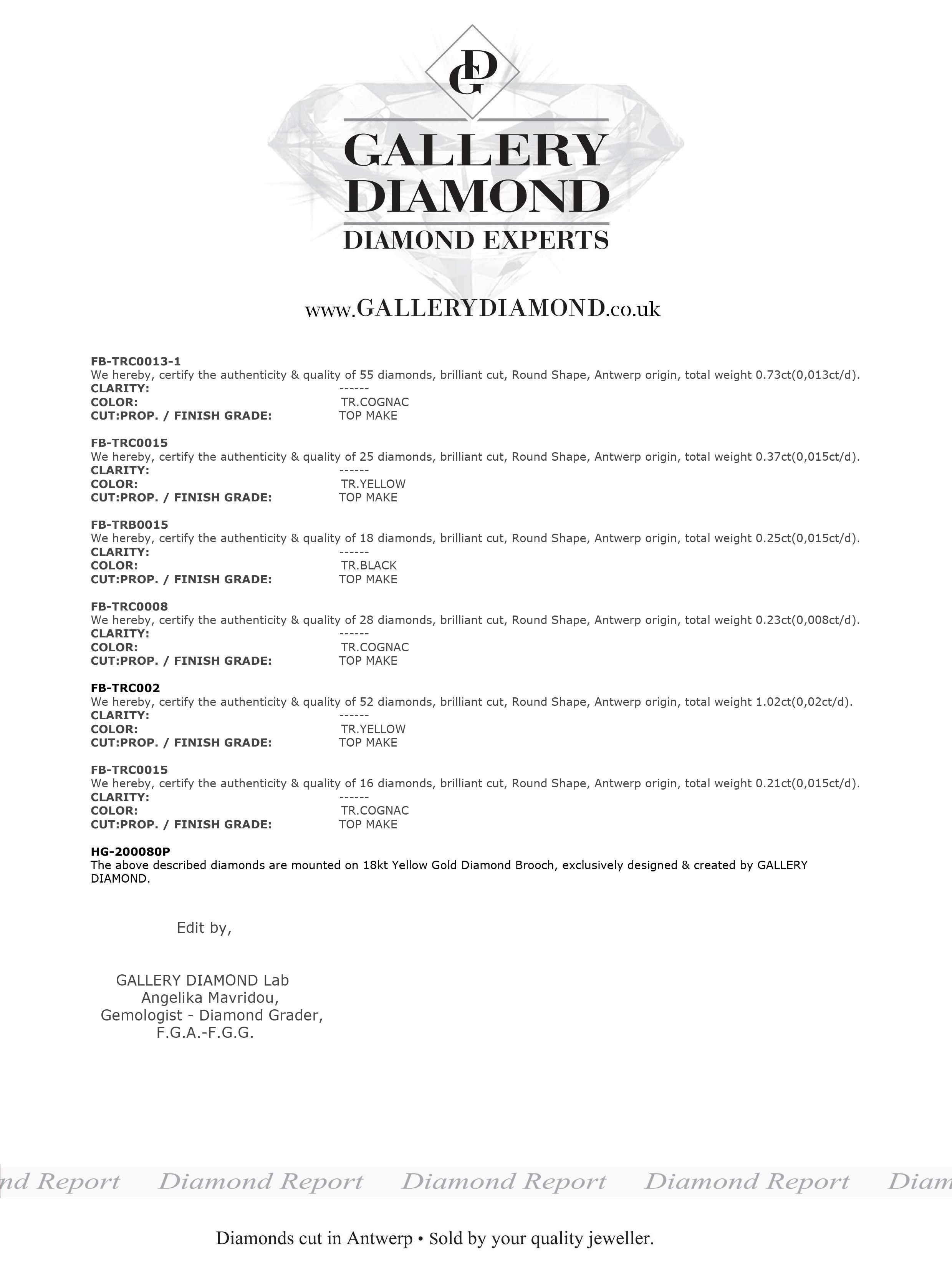 Brooch 18 Kt Yg & Diam.Br.Tr.Cognac 0.013ct x 55d, 0.008ct x 28d, 0,015ct x16d,Diam.Br.Tr.Yellow 0.015ct x 25d, 0.02ct x 52d :2.56ct & Diam.Br.Tr.Black 0.015ct x 18d: 0.25ct t.w.2.81