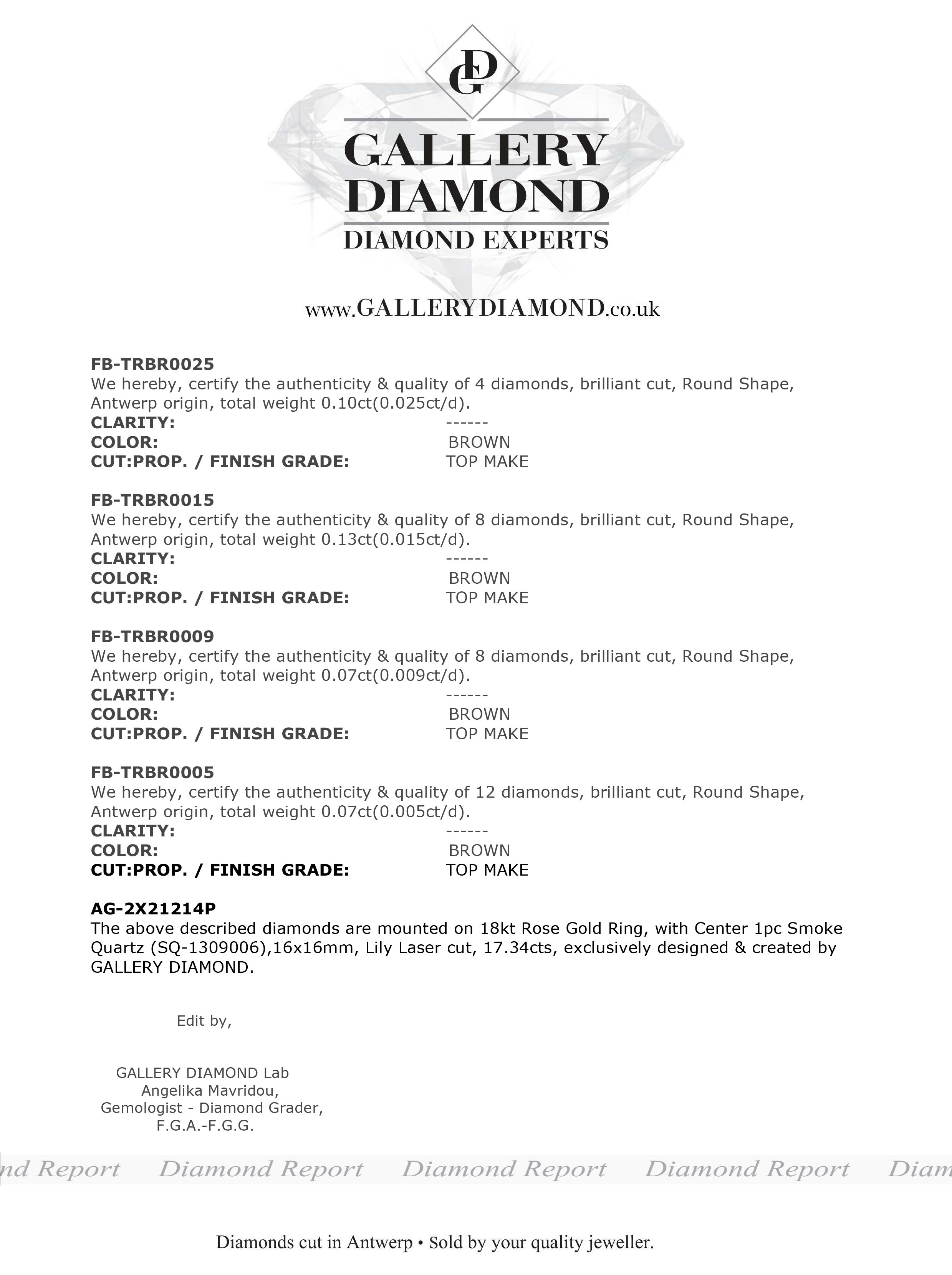 Ring 18kt Pg & Diam.Br.Brown,0,025ct x 4d, 0,005ct x 12d, 0,015ct x8d, 0,009ct x 8d: t.w.:0,37ct & Smoke Quartz Lily Laser 16x16mm,17,34cts